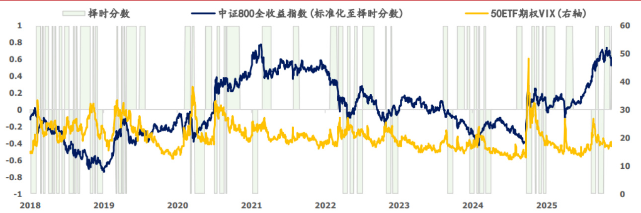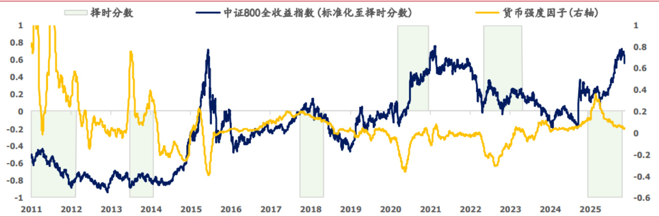- 货币方向因子:指标定义为央行工具利率与短端市场利率相较90天前平均的变化方向,货币方向因子>0判定宽松。报告指出本周货币方向因子>0,得分1(看多)。图示为“货币方向因子与中证800收益”的时间序列对比,该曲线在2025年呈上行位移。图像: