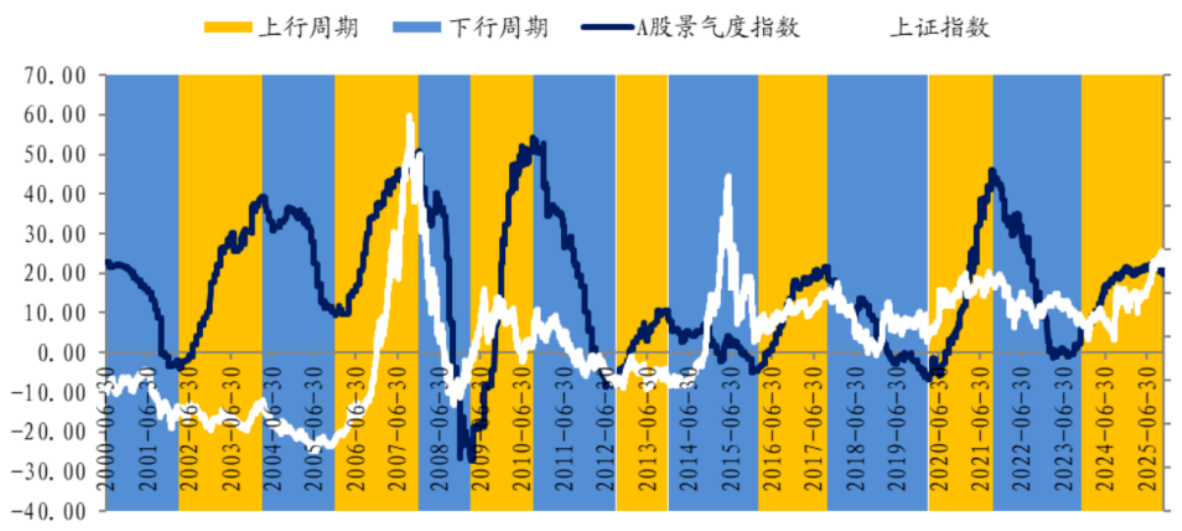 - 解读:报告指出截至2025-11-21,A股景气指数为19.73,较2023年底上升14.30,处于上升周期(文本数据说明)[page::4]。图表显示景气度自2023Q4以来逐步回升,且景气回升在历史上常伴随指数从底部逐步恢复,但景气指数绝对值仍低于历史牛市峰值,提示本轮景气回升仍在早期阶段。[page::4]